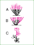 Kresba A: Zimní řez Před vlastním začátkem zimy se všechny výhony zakrátí - podle síly vzrůstu dané odrůdy - na stejnou výšku asi 30 až 50 cm. Kresba B: Jarní řez Na konci zimy následuje hlubší řez. Při něm se bezezbytku odstraní všechny