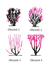Kresba č.1: Prosvětlovací řez zmlazuje keř, specifický tvar růstu odrůdy zůstává zachován. Nutí rostlinu k tvorbě nových výhonů, zejména při zemi (příznivý účinek pro tvorbu květů). Při prosvětlovacím řezu se odstraňují starší, zpravidla přes 3 roky staré výhony zahradnickými či obouručnými nůžkami nebo ruční pilkou. Tyto dřeviny připravily své květní pupeny již v předešlém roce, kvetou tedy nejdříve na dvouletém dřevě, tzn. Ne na výhonech, které vyrostly v tomto roce. Termín se řídí podle doby květu. Na jaře kvetoucí, jako zlatice (Forsythia), kdoulovec (Chaenomeles), jasmín nahokvětý (Jasminum), plamének horní (Clematis montana), meruzalka krvavá (Ribes sanguineum), vrba jíva (Salix caprea),šeřík (Syringa), tavolník (Spiraea), janovec (Cytisus), kalina (Viburnum burkwoodii), zákula (Kerria) a tamaryšek (Tamarix), se stříhají hned po odkvětu. Dřeviny kvetoucí od května nebo ostatní listnáče se prosvětlí až po opadání listí od pozdního podzimu do konce zimy za bezmrazých dnů. K těmto patří: vzpřímeně rostoucí druhy skalníků (Cotoneaster), kolkwitzie (Kolkwitzia), pustoryl (Philadelphus), trojpuk (Deutzia), zanice (Weigela), kalina obecná (Viburnum opulus), hortenzie stromečkovitá (Hydrangea arborescens), zimolez (Lonicera), hlohyně (Pyracantha) a svída bílá (Cornus alba) se svými odrůdami.